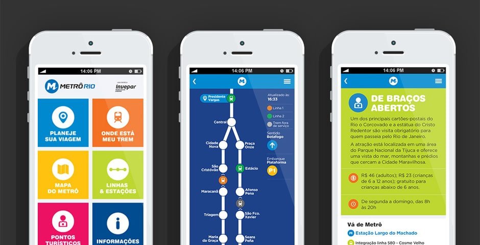 Criamos o MetrôFácil, aplicativo oficial do MetrôRio, em parceria com a empresa Thera. Dentre as funcionalidades, podemos destacar o mapa do metrô, informações sobre linhas e estações, pontos turísticos, como chegar de metrô e o onde está meu trem, que mostra em tempo real os trens que estão chegando na estação onde o usuário está.
