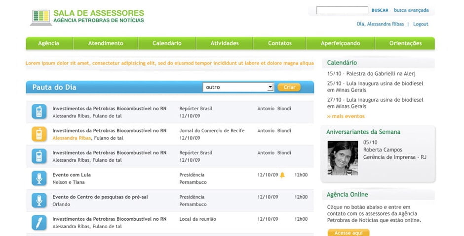 Criamos então a “Sala de Assessores”, uma ferramenta que passou a fazer parte do dia a dia dos jornalistas do maior departamento de imprensa do Brasil. Através desta intranet, os assessores da empresa passaram a registrar seus atendimentos aos principais veículos do Brasil, realizar o acompanhamento de tarefas e enviar comunicados à imprensa, permitindo uma visão gerencial precisa do que acontece na área.