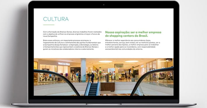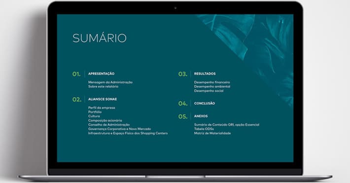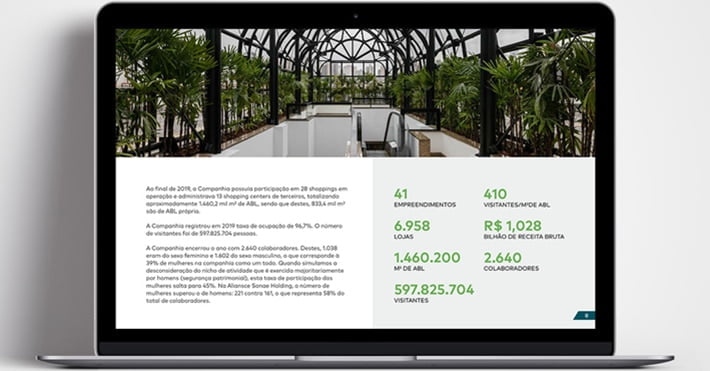 Produzimos anualmente o design do Relatório Socioambiental da Aliansce Sonae, que contém todas as atividades e ações praticadas pelos shoppings do grupo. Criamos um relatório clean e moderno e de acordo com a identidade visual da empresa.