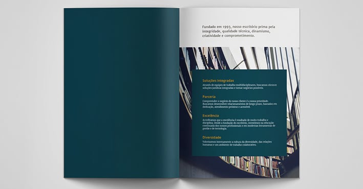 A partir do conceito visual criado para o site, elaboramos o folder institucional do escritório e lâminas separadas de serviços em formato digital.